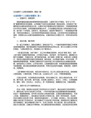 企业副职个人述职述廉报告(精选3篇)企副个人述述廉告篇业职职报1 一、加强学习,提高修养 “我始终重视加强自身的思想修养和政治素质,认真学习邓小平理论,学习三个代”表重要思想和科学发展观,从而增强了与党中央保持高度一致的自觉性,时刻保证了清醒的政治头脑和坚定的政治立场,认真学习经济管理和业务方面的知识,不断提高政策理论水平和文化素养。没有较强的政策理论水平,工作发展就没有后劲;没有较深的文化涵养,就不是一个好领导。没有学习,就没有进步。我坚持不懈地学习,一有闲暇就读书看报,不断充实完善自己。...