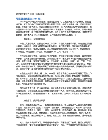 局述职述廉报告2024(精选11篇)局述述廉告职报2024篇1 20xx年区审计局在市局和区委、区政府的领导下,认真贯彻落实xx大精神,紧紧围绕区委、区政府的中心工作和决策部署认真履行职责,持续加大监督力度,切实注重整改“”实效,全面提升服务水平,全力保障包河经济发展。以人才造就工程年活动为载体,努“”力创新审计工作的思路和方法,充分发挥审计免疫系统功能作用。一年来,在局主要领导的团结带领下,在分管科室的积极配合下,本人分管的工作任务顺利完成,根据区考核的要求,现将本人在20xx年度的思想、工...