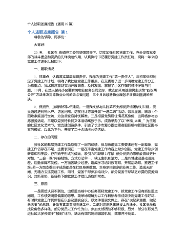 个人述职述廉报告(通用22篇)个人述述廉告篇职报1 尊敬的领导、同事们: 大家好! 20_年,_社区在_街道党工委的坚强领导下,切实加强社区党建工作,充分发挥党支部的战斗堡垒和党员的先锋模范作用,认真执行书记履行党建工作责任制。现将一年来的党建工作述职汇报如下: 一、履职情况 1“”、抓重点,认真落实基层党建责任。我作为党建工作第一责任人,年初即组织制定了党建工作计划,明确了我社区党建工作重点。支委班子进一步明确党建工作分工,为抓重点,我比较注重到实地开展调查,及时发现、掌握了小区存在...