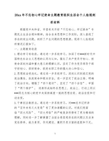 主题教育组织生活会对照《党章》、《准则》、《条例》自我剖析材料这段时间以来,我认真学习《党章》、《准则》、《条例》,逐一对照检视自已,对有关违背初心和使命的问题,分析了存在的原因,提出了整改措施。为进一步做好做实主题教育打下了良好的基础。一、检视存在的问题1、是否坚持党的性质宗旨,贯彻党的基本理论、基本路线、基本方略,坚持四项基本原则,坚持新的发展理念,坚持中国特色社会主义事业“五位一体”总体布局和“四个全面“战略布局方面。本人能够深入学习***新时代中国将色社会主义思想,在思想上政治上行动上自...