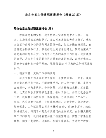 局办公室主任述职述廉报告(精选32篇)局办公室主任述职述廉报告篇1按照局党委的安排,我主持办公室和信息中心工作。一年来,在局党委的正确领导下,在各兄弟单位的大力支持下,我与办公室和信息中心的其他同志团结一致,切实加强自身建设,自觉规范后勤服务行为,积极推进全局信息化建设,较好地完成了局党委和市局办公室、信息中心交办的各项工作任务。这些成绩的取得,是与办公室的其它同志具有较高的素质,以及对我本人的充分信任和支持分不开的。现将我20xx年以来的工作情况报告如下:一、精益求精,文秘工作准确及时机关文秘...