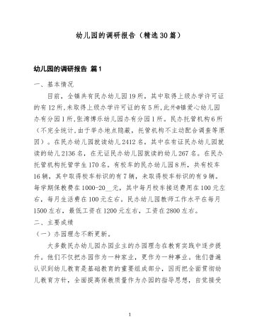 幼儿园的调研报告(精选30篇)幼儿园的调研报告篇1一、基本情况目前,全镇共有民办幼儿园19所,其中取得上级办学许可证的有12所,未取得上级办学许可证的有5所,此外@镇爱心幼儿园办有分园1所,张湾博乐幼儿园办有分园1所。民办托管机构6所(不完全统计,由于举办地点隐蔽,托管机构不主动配合调查等原因)。在民办幼儿园就读幼儿2412名,其中在有证民办幼儿园就读的幼儿2136名,在无证民办幼儿园就读的幼儿267名。在民办托管机构托管学生170名。有校车的民办幼儿园8所,共有校车16辆,其中取得校车标识的有...