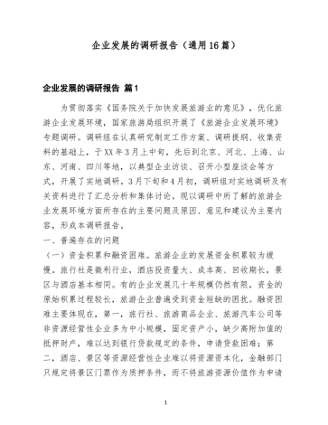 企业发展的调研报告(通用16篇)企业发展的调研报告篇1为贯彻落实《国务院关于加快发展旅游业的意见》,优化旅游企业发展环境,国家旅游局组织开展了《旅游企业发展环境》专题调研。调研组在认真研究制定工作方案、调研提纲、收集资料的基础上,于XX年3月上中旬,先后到北京、河北、上海、山东、河南、四川等地,以典型企业访谈、召开小型座谈会等方式,开展了实地调研。3月下旬和4月初,调研组对实地调研及有关资料进行了汇总分析和集体讨论。现以调研中所了解的旅游企业发展环境方面所存在的主要问题及原因、意见和建议为主要内...