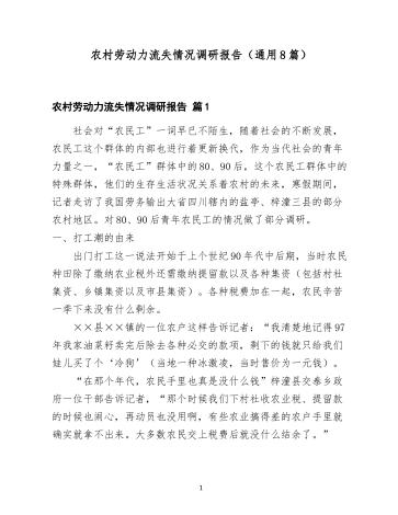 中国农民工调研报告(精选6篇)中国农民工调研报告篇1《国务院关于解决农民工问题的若干意见》实施1年以来,农民工的状况得到有效的改善,特别是工资收入有了明显的提高,月均工资比20xx年增加625元,拖欠问题有所缓解,政府给农民工提供的服务有所加强。但是农民工收入低、处境困难等基本问题还没有得到根本改变,尤其是农民工比较强烈的市民化愿望也远远没有实现。所以必须在进一步落实各项解决农民工问题的政策的同时,还需要进行制度创新,加大相关投入,逐步消除农民工市民化的制度障碍和资金困难,从根本上解决农民工问题...