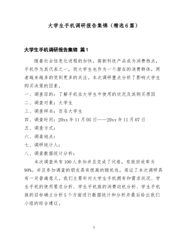 大学生手机调研报告集锦(精选6篇)大学生手机调研报告集锦篇1随着社会信息化进程的加快,高新科技产品成为消费热点,手机作为其代表之一,而大学生也作为一个潜在的消费群体,两者越来越多的受到更多的关注。本次调研重点分析了影响大学生购买决策的因素。一、调查目的:了解手机在大学生中使用的状况及其购买原因二、调查对象:大学生三、调查样本:百名大学生四、调查时间:20xx年11月05日——20xx年11月07日五、调查方式:六、调查地点:七、调研统计人:八、调查数据统计分析:本次调查共有100人参加并且完成了...