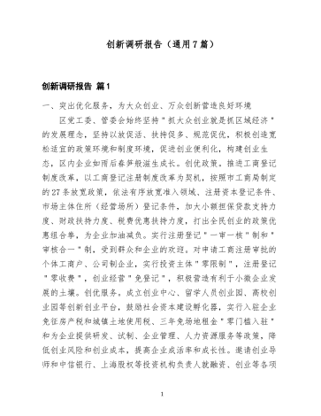 创新调研报告(通用7篇)创新调研报告篇1一、突出优化服务,为大众创业、万众创新营造良好环境区党工委、管委会始终坚持"抓大众创业就是抓区域经济"的发展理念,坚持以放促活、扶持促多、规范促优,积极创造宽松适宜的政策环境和制度环境,促进创业便利化,构建创业生态,区内企业如雨后春笋般滋生成长。创优政策。推进工商登记制度改革,以工商登记注册制度改革为契机,按照市工商局制定的27条放宽政策,依法有序放宽准入领域、注册资本登记条件、市场主体住所(经营场所)登记条件,加大小额担保贷款支持力度、财政扶持力度、税费...