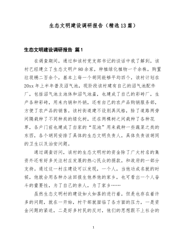 生态文明建设调研报告(精选13篇)生态文明建设调研报告篇1在调查期间,通过和该村党支部书记的谈话中我了解到,该村已经建立了生态文明户80余家,种植绿化植物一千余株,购置垃圾桶二百余个,基本上每一个胡同能够平均四个,该村计划在20xx年上半年普及沼气池,现阶段该村建有自己的沼气池配件厂,包括沼气池主池体和沼气池盖,也建成了自己的彩砖厂,生产各种彩砖,用来内销和外销,还有自己的农产品购销服务部,方便了农产品的销售。该村街道建不设别具风格,除了道路两旁间隔栽种了不同种类的绿化树,还在两棵树之间栽种了各...