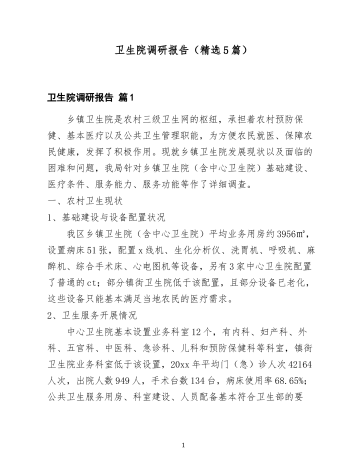 卫生院调研报告(精选5篇)卫生院调研报告篇1乡镇卫生院是农村三级卫生网的枢纽,承担着农村预防保健、基本医疗以及公共卫生管理职能,为方便农民就医、保障农民健康,发挥了积极作用。现就乡镇卫生院发展现状以及面临的困难和问题,我局针对乡镇卫生院(含中心卫生院)基础建设、医疗条件、服务能力、服务功能等作了详细调查。一、农村卫生现状1、基础建设与设备配置状况我区乡镇卫生院(含中心卫生院)平均业务用房约3956㎡,设置病床51张,配置x线机、生化分析仪、洗胃机、呼吸机、麻醉机、综合手术床、心电图机等设备,另有...