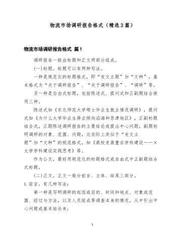 物流市场调研报告格式(精选3篇)物流市场调研报告格式篇1调研报告一般由标题和正文两部分组成。(一)标题。标题可以有两种写法。一种是规范化的标题格式,即“发文主题”加“文种”,基本格式为“关于调研报告”、“关于调研报告”、“调研”等。另一种是自由式标题,包括陈述式、提问式和正副题结合使用三种。陈述式如《东北师范大学硕士毕业生就业情况调研》,提问式如《为什么大学毕业生择业倾向沿海和京津地区》,正副标题结合式,正题陈述调研报告的主要结论或提出中心问题,副题标明调研的对象、范围、问题,这实际上类似于“发...