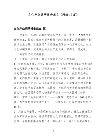 文化产业调研报告范文(精选12篇)文化产业调研报告范文篇1近年来,荷塘区认真贯彻落实中央、省、市关于“加快文化体制改革,推动文化大发展大繁荣”的决策部署,紧紧围绕“打造以生态宜居、文化休闲”为特征的商贸次中心发展定位,加快文化体制改革、文化事业和文化产业发展,取得了一定成绩。一、荷塘区文化发展现状(一)发展三大优势,奠定了发展文化产业的基础1、文化底蕴丰厚。目前,我区的文化形态主要有以龙山寺和仙庾庙为代表的宗教文化;以硬质合金厂、车辆厂、千金药业等为代表的现代企业文化;以流芳园、抗日工事遗迹、抗...