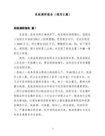 系统调研报告(通用8篇)系统调研报告篇1在县委、县政府的正确领导下,我县税收持续增长,国税收入连续五年保持20%以上的高增幅,更是高位运行,完成各税收入8689万元,同比增收2322万元,增幅高达36。5%,创下超历史、超同期、超计划的喜人业绩,并实现了税收总量三年翻一番的巨大突破。然而,从我县税源的结构特点及发展趋势来看,我县国税收入在达到一定规模之后,要实现持续增长,尚存在许多有待调整与改进的问题。一是缺少一批具有相当影响力的纳税大户。市60强企业中,我县仅4家入围,所占企业份额在7县市(含...