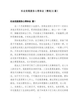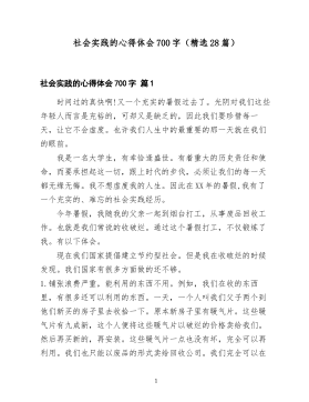 社会实践的心得体会700字(精选28篇)社会实践的心得体会700字篇1时间过的真快啊!又一个充实的暑假过去了。光阴对我们这些年轻人而言是充裕的,可却又是缺乏的,因此我们要珍惜每一天,让它不会虚度。也许我们人生中的最重要的那一天就在我们的眼前。我是一名大学生,有幸恰逢盛世。有着重大的历史责任和使命,而要承担起这一切,跟上时代的步伐,必须让我们的每一天都无缘无悔。我不想虚度我的人生。因此在XX年的暑假,我有了一个充实的、难忘的社会实践经历。今年暑假,我随我的父亲一起到烟台打工,从事废品回收工作。也就是我们常说的收破烂。通过这个暑假打工,不仅锻炼了我。有以下体会。现在我们国家提倡建立节约型社会。但是我在收破烂的时候发现。我们国家有很多方面做的还不够。1.铺张浪费严重,能利用的东西不用。例如,我们在收的东西里,有很多还可以利用的东西。一天,一个人叫我们父子两个到他们新买的房子里去收拾一下。原本新房子里有暖气片。这些暖气片有九成新,这个人便将这些暖气片以破烂的价格卖给我们。然后再买新的,再安装。这些暖气片一点也没有坏,完全可以再利用。我们也只能以废品的形式卖给回收公司。我们完全可以在1利用这些东西,为国家节省一些资源。我认为这些行为与我们国家的建设宗旨是相违背的。2.对一些能够回收利用的东西,我们国家不回收利用。例如,很多瓷器和建筑垃圾不回收利用。据报道,我们国家每年的建筑垃圾为一百亿吨。如果我们国家能回收利用,我们国家每年建筑垃圾的百分之十,我们将节约三十万公顷的土地。从而为国家节约开挖土地资金约十亿元人民币。因此我认为我们国家应该重视对这一方面开发与利用,能为我们建设节约型社会提供动力。3.我们大部分人不能区分一些有价值并能够回收利用材料。我就拿塑料来说,思想汇报专题据报道在我们国家有大约三千种塑料在我们的各行各业中运用。但是其价值却迥然不同。最贵的一种价值几百元一斤,最便宜的一...