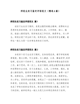 师范生实习鉴定评语范文(精选4篇)师范生实习鉴定评语范文篇1该实习生在实习期间,表现出强烈的敬业精神,深厚的专业思想和良好的师德。实习态度极其认真,工作积极、细心、踏实,能虚心接受指导,较好地完成工作任务。热爱学生、关心学生,特别注意了学生的个别,效果良好。因此深受学生爱戴。被师生一致认为是一位非常优秀的实习老师。师范生实习鉴定评语范文篇2本校四个实习生在实习期间,总体表现优秀,遵守学校的规章制度,服从分配,听从安排。为人谦虚、认真、勤奋好学,刻苦钻研。经过四个月的学习、实践和锻炼,能将所学理论指导实际工作,善于思考,举一反三。在实习期间,表现出强烈的敬业精神和深厚的专业功底、实习态度端正、认真,工作积极、塌实,能虚心接受指导,能将所学教学理论应用与教学实践。备课一丝不苟,选择适当,上课秩序掌控得宜,作业批改认真。热爱学生,关心学生,深受学生的爱戴,表现出了一名优秀教师应有的能力和素质。总的来说,经过实习期间的工作和学习,他们都很好的完成了学校交给的各项任务,综合素质得到较大提高,达到了实习的目的。被学校师生一致认为是几位非常优秀的实习老师。1师范生实习鉴定评语范文篇3一、服务态度热情、主动、积极。对事物保持高度的好奇与,虚心求教並勇於建言。隨时调整自己,力求成长、尽善。积极爭取机会,发挥所长,磨练带领技巧。例:指导乡土戏剧演出、国竞赛、游行、新诗,並能巧妙地引导学生將枯燥乏味的例行公事趣味化。二、教学实习表现高度热忱,讲解鉅细靡遗,能兼顾不同程度学生的需要,亦能根据学生反应及教师指导调整板书、速度、教学方式、內容……,努力求得学生最大利益。批改作业认真,评语多样、丰富而恳切。上课秩序掌控得宜,收放自如,优秀稳健。发现问题能主动提出討论,討论中流露极佳学养与见识。三、导师实习熟悉学生背景、性情。心思细腻,眼光独到,善於观察並发现问题。常利用下课、午餐时间和学生谈话,给予引导...