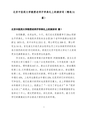 北京中医药大学教授老师开学典礼上的演讲词(精选31篇)北京中医药大学教授老师开学典礼上的演讲词篇1告别酷暑,走进金秋。今天,我们在这里隆重举行20xx级新生开学典礼。今年我校共录取来自全国28个省市和港澳台地区的新生3074名,其中本科生2511名、硕士研究生509名、博士研究生54名。首先请允许我代表全校师生员工对全体新同学的到来表示热烈的欢迎!你们的到来,使我们北京中医药大学这个大家庭更加充满青春活力,更加显得生机盎然。作为校长,我感到非常高兴医学教育|网搜集整理,因为北京中医药大学又增添了一大批十分优秀的同学。今年我校第一批录取的新生,理科最低647分,高出北京省组档线30分,排省属院校第三名;文科最低645分,高出北京省组档线26分,排省属院校第二名,录取分数线创历史新高。研究生第一志愿考生数较去年增长45%,上线考生数较去年增长25%.这是同学们对学校的认可和信任。我们在高兴的同时也深感责任重大。在上学期的学校本科教学工作会议上,我提出了“一切为了学生成才”和“视学生为亲人”的观点,目的就是要求学校的所有工作都要围绕学生培养这个中心,通过更新观念,深化改革,改善条件,着力为同学们的健康成长和全面成才提供优良的环境。1同学们,一所大学的灵魂和品质往往集中体现在校训上。我们北京中医药大学的校训是“求本远志”。求本是中医治病术语,本意指治病时不要被表面现象所迷惑,要透过现象看本质,针对疾病的根本进行治疗,寓意严谨、求实;远志,是中药名,寓意志存高远,开拓创新。“求本远志”校训精神是学校几代人历经半个多世纪励精图治,薪火相传,凝练升华而成的。抚今追昔,我们北京中医药大学可谓历经沧桑却又充满生机。从五十年代初开始办学到六十年代几经合并,从恢复单独招生到移址新建,北京中医大人依靠自己的热情和力量,成功渡过了一个又一个重要历史关口,用自己的智慧和勇气描绘着一幅又一幅绚丽多姿画卷...