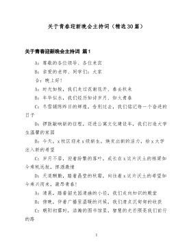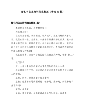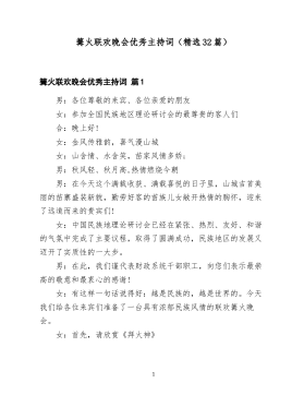 篝火联欢晚会优秀主持词(精选32篇)篝火联欢晚会优秀主持词篇1男:各位尊敬的来宾、各位亲爱的朋友女:参加全国民族地区理论研讨会的最尊贵的客人们合:晚上好!女:金风传雅韵,喜气漫山城女:山含情、水含笑,苗家风情多娇;男:秋风轻、秋月高,热情燃烧今朝男:在今天这个满载收获、满载喜悦的日子里,山城吉首美丽的苗寨盛装新貌,勤劳好客的苗族儿女敞开热情的胸怀,迎来了远道而来的贵宾们!女:中国民族地理论研讨会已经在紧张、热烈、友好、和谐的气氛中完成了主要议程,取得了圆满成功,民族地区的发展又迈开了实质性的一大步。男:在此,我们谨代表财政系统干部职工,向您们表示最崇高的敬意和最衷心的感谢!女:有这样一句话说得好:越是民族的,越是世界的。今天我们给各位来宾们准备了一台具有浓郁民族风情的联欢篝火晚会。女:首先,请欣赏《拜火神》1合:让我们在这熊熊的篝火中尽情燃烧我们的热情,让我们在这欢乐的歌舞中架起民族友谊永恒的桥梁!3、马桑树儿搭灯台男:刚才的群体鼓舞,可以说体现了咱们苗家姑娘英姿飒爽、热情奔放的一面,接下来要请各位来宾欣赏的,是一首我们大湘西地道的民歌,它所表达的又是湘西儿女那浪漫多情、坦诚率真而又重情重义的一面。我们湘西籍歌唱家宋祖英还曾把这首歌搬进了她在悉尼歌剧院的个人演唱。请欣赏由湘西州歌舞团族歌唱家带来的湖南民歌──《马桑树儿搭灯台》。5、代表团节目男:众所周知,我们中华民族是一个多民族的大家园,每个少数民族都有自己独特魅力的风俗人情、语言艺术等等,我们这次的全国民族地区理论研讨会,更有许多来自民族地区的兄弟姐妹,而且个个绝对称得上是多才多艺、能歌善舞。好,接下来就让我们一饱耳福和眼福,来欣赏一组贵宾代表团为我们带来的节目。首先有请结束:男:难忘今宵,今宵我们有缘相聚、济济一堂女:难忘今宵,今宵我们欢声笑语、歌舞飞扬女:相聚的时光虽然短暂,民族的情谊将远播四方男:各位亲爱的朋友、各...