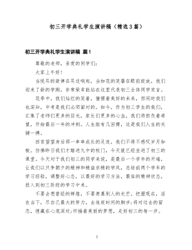 初三开学典礼学生演讲稿(精选3篇)初三开学典礼学生演讲稿篇1尊敬的老师,亲爱的同学们:大家上午好!当悦耳的旋律在耳边响起,当如花的笑靥在眼前绽放,我们迎来了新的学期。非常荣幸能站在这里代表初三全体同学发言。花季中,我们灿烂的笑着,憧憬着美好的未来,但同时我们也深知,中考是我们必须面对的。如今,作为初三学生的我们,汇集了老师们更多的目光,家长们更多的心血,我们将担负着希望,开始最后一年的冲刺。人生能有几回搏,这是我们人生的关键一搏。回首望望身后那一串串成长的足迹,我们不得不感叹岁月如梭。仿佛昨日我们才踏进九中的校门,今天就已经坐进了初三的课堂。今天对于我们初三的同学来说,是最后一个学年的开端,让我们以只争朝夕的精神和精益求精的学风,总结前两个学年的学习经验,调整好心态,以最好的学习方法,最佳的精神状态,投入到初三阶段的学习中来。不要去想曾经的辉煌,不要羡慕别人的光芒。把握现在,活在当下,尽自己最大的努力,去追赶时间的脚步;将对过去的留恋,埋藏在心底深处;怀揣着美丽的梦想,走好初三的每一步。1初一的学弟学妹们,欢迎你们加入九中这个大家庭。初中三年,转瞬即逝,你们要把握好这三年中的每一分每一秒,三年后,你们的笑容,会更加灿烂。初二的同学们,经过一年的历练,你们已然不是当初那个天真的孩童,现在的你们变得更加成熟,更加坚定。不负父母的期盼,不负恩师的厚望,不负天赐的智慧,不负青春的理想。我们将带着从容的微笑,熠熠闪光!静心砥砺,脚踏实地,争分夺秒凌绝顶,让青春无悔;拒绝蹉跎,志在高天,你追我赶展雄风,为九中争辉!初三开学典礼学生演讲稿篇2我原创的哦!我也用了呢!绝对原创各位领导,各位老师、同学们:转眼,伴随着秋天的气息,又是一个新学期的到来,对每一个同学来说,都是一个新的起点。首先让我们欢迎初一的新同学们加入XX中学这个大家庭。新的学期,新的开始,带来了新的挑战,也孕育着新的希望与憧...