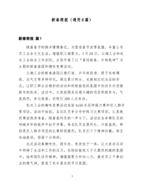 新春简报(通用8篇)新春简报篇1随着春节的脚步慢慢靠近,为营造春节浓厚氛围,丰富公司员工业余文化生活,增强职工凝聚力,1月29日,云湘工会和机关工会结合工作实际,分别开展了以“喜迎新春、牛转乾坤”为主题的新春游园和趣味竞赛活动。云湘工会的新春游园以猜灯谜、乒乓球投准、筷子夹玻璃球、运气王等多种形式,通过累计积分、兑换相应纪念品的形式,让职工群众在精彩的活动和积极愉悦的氛围中快快乐乐迎接新年的到来。活动中,大家按照各自感兴趣的项目积极参与,气氛热烈,参与度高,共吸引389人次参加。机关工会的趣味竞赛活动包括4x50米花样接力赛和巨人脚步等项目。活动开始前,各位队员争分夺秒练习比赛项目,认真做好赛前热身准备,随着裁判员的一声令下,活动在各参赛队员的呐喊声和助威声中拉开序幕,每名队员各展所长、兴致盎然,特别是巨人脚步项目的比赛特别激烈,队员们个个精神抖擞,相互加油鼓劲,场面十分热闹。此次活动集趣味性、娱乐性、竞技性于一体,让大家在运动中卸掉了生活和工作的压力,在轻松愉悦又不乏激烈刺激的氛围中,培养团队协作精神,增强凝聚力和向心力,激发员工干事创业的精气神,营造了欢乐喜庆的节日氛围。1回首20xx年,新冠肺炎疫情肆意蔓延,面对繁重的生产经营任务和较大的防疫压力,郴州公司全体员工齐心协力抗疫保产,圆满地完成了生产经营目标任务。20xx年,郴州公司发展面临的挑战与机遇并存,相信在公司党委的正确领导下,全体员工勠力同心、共同奋斗,一定能开启郴州公司持续健康发展的新征程,书写公司改革发展的新辉煌。新春简报篇2一年一度的新春佳节即将来临,过新年,贴春联是中华民族的传统文化,为营造吉祥如意的春节氛围,把吉祥祝福送到千家万户。20__年1月18日上午,和昌都汇华府小区物业携手中共朱岗社区和昌都汇华府党支部在物业活动中心共同举办新年写春联活动。中共朱岗社区和昌都汇华府小区党支部的党员们作为志愿者早...