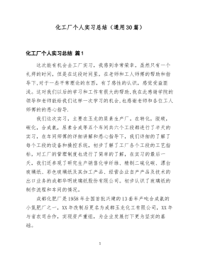 化工厂个人实习总结(通用30篇)化工厂个人实习总结篇1这次能有机会去工厂实习,我感到非常荣幸。虽然只有一个礼拜的时间,但是在这段时间里,在老师和工人师傅的帮助和指导下,对于一些平常理论的东西,有了感性的认识,感觉受益匪浅。这对我们以后的学习和工作有很大的帮助,我在此感谢学院的领导和老师能给我们这样一次学习的机会,也感谢老师和各位工人师傅的的悉心指导.我们这次实习,主要在玉龙的尿素生产厂。在转化,脱碳,碳化,合成氨,尿素合成等五个车间共六个工段都进行了半天的实习,在车间师傅的详细讲解和悉心指导下,我们详细的了解了每个工段的设备和操控系统,初步了解了工厂各个工段的工艺指标,对工厂的管理制度也进行了简单的了解,在实习的最后一天,我们还参观了研究生产销售化学纤维、精制二硫化碳、漂白玻璃纸、彩色玻璃纸及其加工产品、经营企业自产产品及技术的出口业务的成都华明玻璃纸股份有限公司。初步认识了玻璃纸的制作流程和车间的情况。成都化肥厂是1958年全国首批兴建的13套年产吨合成氨的小氮肥厂之一,XX年改制后更名为成都玉龙化工有限公司,XX年与省农司合作,实现资产重组,为企业发展打下更为坚实的基础。140多年的艰苦创业,公司多次受到原化工部、四川省和成都市各级领导的表彰,荣获原化工部首批命名的"六好企业"、"精神文明工厂"、"全国环境优美工厂"等殊荣。"裕农"牌碳铵、尿素获部优、省优。98年以来公司不断进行技术改造,先后采用四套先进的进口和国产dcs计算机控制系统,使产品产量、质量不断提高,成本不断降低。目前,公司具有年产10万吨合成氨、13万吨尿素、10万吨碳铵、10万吨复合肥的化肥生产能力。在"质量第一、用户至上"的生产经营宗旨指导下,产品深得用户好评和市场亲睐,XX年荣获四川化学原料及化学制品制造业工业企业最大市场占有份额30强,XX年公司"裕农"牌尿素被四川省质量技术监督局列入免检产品,X...