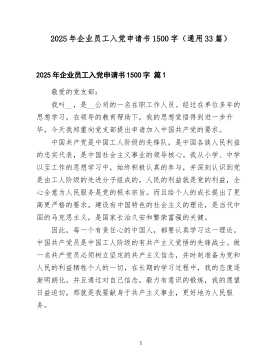 2025年企业员工入党申请书1500字(通用33篇)2025年企业员工入党申请书1500字篇1敬爱的党支部:我叫__,是__公司的一名在职工作人员。经过在单位多年的思想学习,在领导的教育帮助下,我的思想觉悟得到进一步升华,今天我郑重向党支部提出申请加入中国共产党的要求。中国共产党是中国工人阶级的先锋队,是中国各族人民利益的忠实代表,是中国社会主义事业的领导核心。我从小学、中学以至工作的思想学习中,始终积极认真的参与,并深刻认识到党是由工人阶级的先进分子组成的,人民的利益就是党的利益,全心全意为人民服务是党的根本宗旨。而且给个人的成长提出了更高更严格的要求。建设有中国特色的社会主义的理论,是当代中国的马克思主义,是国家长治久安和繁荣富强的关健。因此,每一个有责任心的中国人,都要认真学习这一理论。中国共产党员是中国工人阶级的有共产主义觉悟的先锋战士。做一名共产党员必须树立坚定的共产主义信念,并时刻准备为党和人民的利益牺牲个人的一切,在长期的学习过程中,我的态度逐渐明朗化,并且通过对自己信念,毅力有意识的锻炼,我的愿望日益迫切,那就是我要献身于共产主义事业,更好地为人民服务。1在革命战争年代,党员意味着流血,牺牲;在和平建设年代,党员意味着吃苦在前,享乐在后。但共产党员称号又是光荣的,因为他们要用自己的劳动和心血为人民服务,这同时又是一个人生命意义的升华。先天下之忧而忧,后天下之乐而乐的崇高境界,使多少共产党长期以来的追求。为树立自己正确的入党动机,我努力做到以下几点:1、认真学习党的理论思想。在参加工作之前,我就有意识地阅读《选集》,《文选》等经典着作,并认真地做读书笔记,努力使自己从着作中体会经典文献的精髓,通过学习,把朴素直观的认识尽量上升到自觉,理性的高度,从而使自己的入党动机逐步清晰,深刻。2、通过实践锻炼,不断提高自己的觉悟。在学习优秀党员的过程中。我努力培养自己对党...