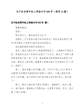 关于私自带手机上学检讨书400字(通用14篇)关于私自带手机上学检讨书400字篇1尊敬的教官:您好!军训四天了,漫长的四天过去了!说漫长,不只是因为度日如年的苦训,更因为我收获到了很多!军训教会了我很多!就比如这次的检讨。我先就昨晚的问题作自我检讨:首先,错在不服从命令!课前明明规定了,上课期间不得玩手机,而我把它当作了耳旁风!这是与“令必行,禁必止”的军人精神背道而驰了的。退一万步,就拿最基本的道德素质也是讲不过去的,教官在上面讲课,尊重他人的基本就不允许我的行为了!所以,我错了!第二,错在顶撞上级!顶撞上级,又叫以下犯上!这个罪名又多重呢?在历朝历代都是死刑!我耍个人脾气,不满上级的处罚,言行上有冲撞。该不该呢?不该!因为服从是天职!所以,我又错了!第三,错在认错态度不端正!找借口,错就错了,找什么借口,借口越多,错就越大!思想自由,这是要不得的。所以,我又错了!错上加错!1我想成为强者!那就得直面我的错误!勇敢的去承认错误,改正错误!我是这么想的,也会这么做!希望在场的我的战友们也能够相信我!检讨人:关于私自带手机上学检讨书400字篇2老师:您好!这次犯错误,自己想了很多东西,反省了很多的事情,自己也很懊悔,很气自己,去触犯学校的铁律,也深刻认识到自己所犯错误的严重性,对自己所犯的错误感到了羞愧。学校一开发笭篡蝗诂豪磋通单坤学就三令五申,一再强调校规校纪,提醒学生不要违反校规,可我却没有把学校和老师的话放在心上,没有重视老师说的话,没有重视学校颁布的重要事项,当成了耳旁风,这些都是不应该的。也是对老师的不尊重。应该把老师说的话紧记在心,把学校颁布的校规校纪紧急在心。事后,我冷静的想了很久,我这次犯的错误不仅给自己带来了麻烦,耽误自己的学习。而且我这种行为给学校也造成了及其坏的影响,破坏了学校的管理制度.在同学们中间也造成了不良的影响。由于我一个人的犯错误,有可能造成别...