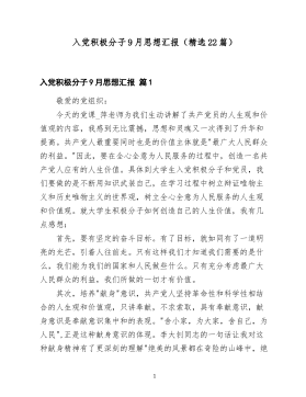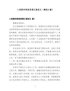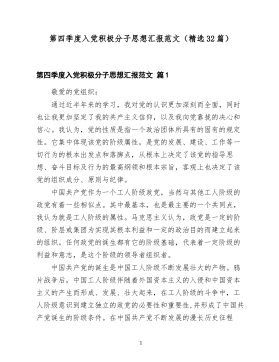 入党积极分子2025年四季度思想汇报(通用29篇)入党积极分子2025年四季度思想汇报篇1敬爱的党组织:经过近期对党的理论的学习,我受益匪浅,让我深刻了解了如何做一名合格党员,一个党员同志在社会中所应扮演的角色。共产党员应该是旗帜,是模范!要牢记、领会党的思想和精神,紧跟时代的步伐,与时俱进,开拓进取,在工作学习上有所建树。党员是平凡的,他需要那份默默无闻的贡献和宁静致远的衣钵;党员也应该是优秀的,他们战斗在各条战线上,起者模范带头作用,他们需要有渊博的知识或是精湛的技术,进步的思想。我希望自己成为这样一个人,既拥有丰富的学识,又能够在平凡中帮助别人,影响别人,不一定要轰轰烈烈,叱咤风云,但一定要真真切切,坚持党的思想路线,解放思想、实事求是、与时俱进,是我们党坚持先进性和增强创造力的决定性因素。形势逼人,不进则退。在充满机遇与挑战的21世纪里,共产党员一定要按照党的思想路线的新要求,站在时代发展的最前列,充分发挥先锋模范作用。做一名合格的共产党员,必须认真学习马列主义、毛泽东思想、邓小平理论、"三个代表"重要思想和科学发展观理论,树立正确的世界观、人生观和价值观;努力学习科技文化知识,增强做好实际工作的本领。具有严密的组织纪律性和铁的纪律,是我们党的政治优势,是党的先进性的标志。1要成为一名合格的共产党员,就必须在思想上和行动上都入党。要思想上入党,就要自觉学习党的规章制度、文件政策,学习党的先进理论;要行动上入党就要在生活上、工作上起先锋模范作用。作为党员应该有崇高的追求,有较强的自觉性,在实际行动中实践党的理论,执行党的路线、方针、政策。无论何时何地,一名合格的党员应该系祖国命运、党的命运,把个人的力量奉献给党!我将永远以这个标准严格要求自己!此致敬礼汇报人:fanwenhai汇报时间:XX年XX月XX日入党积极分子2025年四季度思想汇报篇2敬爱的党组织:作为一名入...