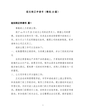 组长转正申请书(精选10篇)组长转正申请书篇1尊敬的人力资源主管:我于xx年3月25日成为公司的试用员工,根据公司的需要,目前担任采购专员一职,负责成本部采购管理中的相关工作。到今天3个月试用期临近结束,遵照公司的规章制度,现申请转为公司正式员工。我的主要工作可以总结如下:一、收集整理供应商资料,为其建立数据库,并分门别类逐步细化在供应商普遍生产多种产品的基础上,只看他的宣传资料就能确定出主打产品,按要求归类,制作出具有各种衡量标准的表格并细化登记,要耗费一定的时间和精力,采购人员要给与一定的重视。二、公文写作等文字方面的工作:正式启动采购管理程序前,书写申请或请示上报主管领导;和其他部门有工...