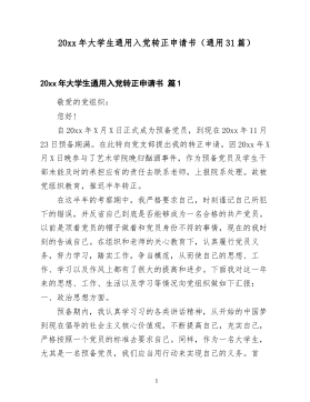 20xx年通用预备党员转正申请书范文(优秀31篇)20xx年通用预备党员转正申请书范文篇1敬爱的党组织:我于20x年x月x日被党组织批准为一名光荣的中国共产党预备党员,这一光荣称号不断激励着我,成为我工作、学习、生活的新动力。在这一年里,我有了一种新的归属感,在这个充满温暖,充满力量的集体中,我不断成长。在我的预备期届满之际,我郑重向党组织提出转正申请。并将我入党一年来的思想、工作、学习、生活等情况作个汇报。入党前,从未想过自己入党前后会有多大的区别,因为一直以来,我对工作认真负责,并始终抱以的热忱,对周围的人真诚相待,相儒以沫,这些都是我觉得理所当然的,那也是做人最基本的准则。那是一种无愧于...