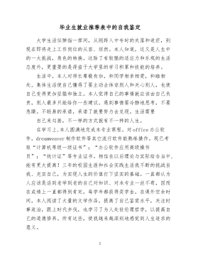 简短优秀的毕业生自我鉴定范文大学两年是我一生的重要阶段,是学习专业知识及提高各方面能力为以后谋生发展的重要阶段.从跨入大学的校门的那一刻起,我就把这一信念作为人生的又一座右铭.大学两年里,在提高自己科学文化素质的同时,也努力提高自己的思想道德素质,使自己成为德,智,体诸方面全面发展,适应21世纪发展要求的复合型人才,做一个有理想,有道德,有文化,有纪律的社会主义建设者和接班人.大学两年,塑造了一个健康,充满自信的我,自信来自实力,但同时也要认识到,眼下社会变革迅速,对人才的要求也越来越高,社会是在不断变化,发展的,要用发展的眼光看问题,自身还有很多的缺点和不足,要适应社会的发展,得不断提高思想...
