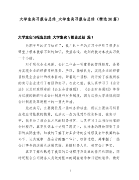 大学生实习报告总结_大学生实习报告总结(精选30篇)大学生实习报告总结_大学生实习报告总结篇1为期半年的实习结束了,我在这半年的实习中学到了很多在课堂上根本就学不到的知识,受益非浅。此刻我就对本次实习做一个小结。对于现代企业来说,会计工作是一项重要的管理制度,是要为实现企业的经营目标服务。所以,能够认为,实现企业的经营目标是企业会计的根本目标。带着这个目标,我开始了在我所在的实习企业进行了有目的实习。在此之前,我认真学习了《会计法》以及财政颁布的《企业会计准则》、《企业财务通则》等作为过渡的新的行业会计制度和财务制度,因为这些大学法规我国会计制度改革进程中的一重大举措。此次实习,主要岗位是一些帐务的核查,所以主要实习科目应收应付帐款的核算,也涉及一些其他对外投资科目。在实习中,我参加了该企业月末的财务核算,认真学习了正当而标准的会计程序,真正从课本中走到了现实中,从抽象的理论回到了多彩的实际生活,细致的了解了财务会计的全过程及会计核算的各环节,认真观摩一些会计的整个审计、核算过程,并掌握了一些会计事务的适用及适用范围。跟随财务人员,核实会计事实。真正了解和熟悉了我国的公诉程序及法庭的作用和职能,同时还配合公司财务人员做好帐本的调查笔录和日记帐笔录,做好1帐簿的装订归档工作。经过1个半月的实习,我从客观上对自我在学校里所学的知识有了感性的认识,使自我更加充分大学解了理论与实际的关系。我这次实习所涉及的资料,主要是会计业务(对公业务),其他一般了解的有购货业务、票据业务、贷款业务。会计业务对公业务的会计部门的核算(主要指票据业务)主要分为三个步骤,记帐、复核与出纳。那里所讲的票据业务主要是指支票,包括转帐支票与现金支票两种。对于办理现金支票业务,首先是要审核,看出票人的印鉴是否与银行预留印鉴相符,方式就是经过大学验印,或者是手工核对;再看大小写金额是否一致,出票金额、出票日期、...
