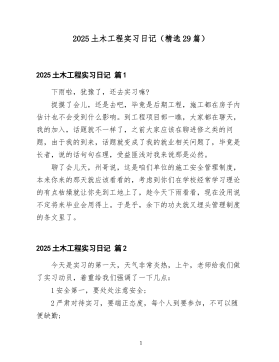 2025土木工程实习日记(精选29篇)2025土木工程实习日记篇1下雨啦,犹豫了,还去实习嘛?捉摸了会儿,还是去吧,毕竟是后期工程,施工都在房子内估计也不会受到什么影响。到工程项目部一瞧,大家都在聊天,我的加入,话题就不一样了,之前大家应该在聊进修之类的问题,由于我的到来,话题就变成了我的就业相关问题了,毕竟是长者,说的话在理,受益匪浅对我来说那是必然。聊了会儿天,州哥说,这是咱们单位的施工安全管理制度,本来你来的那天就应该看看的,考虑到你们在学校经常学习理论的有点枯燥就让你先到工地上了,趁今天下雨看看,现在没用说不定将来毕业会用得上。于是乎,余下的功夫就又埋头管理制度的条文里了。2025土木工程实习日记篇2今天是实习的第一天,天气非常炎热,上午,老师给我们做了实习动员,着重给我们强调了一下几点:1安全第一,要处处注意安全;2严肃对待实习,要端正态度,每个人到要参加,不可以随便缺勤;13一切行动听指挥,不要擅自独立行动;4在实习中可以帮助我们这些大一新生对土木工程有个感性的基础的认识,为将来的专业课程的学习打下良好基础今天我们实习的目标是我校的本部,因为本部是新建的,好多建筑具有现代的风格我们首先来到体育馆,在里面,我们参观了篮球场和羽毛球馆我们来到顶层遮阳棚是网架结构老师还讲解了体育馆的好多结构通过老师的介绍使我们了解到作为公共设施的体育馆,必须考虑以下几点:1,进出场地的方便;2,活动场所宽广;3有足够的建筑强度;4,造型美观,给人以艺术的享受随后,我们来到学校的图书馆,图书馆是本校的标志性建筑,21层楼,非常宏伟离学校很远的的地方就能看见这座挺拔的建筑图书馆的最顶端是几根柱子,柱子之间用横粱连接起来当我们问老师为什么要这样时,老师答到:“一方面是为了美观,另一方面是为了稳固性”下午我们在老师的带领下,我们参观了本校的教学主楼在学校的教学主楼,我们了解到了变形缝的相关知...