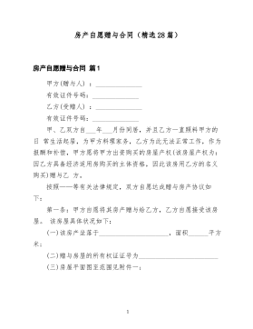 房产赠与协议父母赠与子女(精选30篇)房产赠与协议(父母赠与子女)(精选30篇)房产赠与协议(父母赠与子女)篇1甲方(代持人):________,性别:______________,____族,身份证号码:______________________,联系地址:_______________________,电话:____________________________。乙方(实际所有人):______,性别:______________,____族,身份证号码:___________________,联系地址:____________________,电话:____________________________。丙方(实际出资人):_______,性别:______________,____族,身份证号码:___________________,联系地址:_______________________,电话:____________________________。丁方(实际出资人):_______,性别:______________,____族,身份证号码:___________________,联系地址:_______________________,电话:____________________________。1甲、乙、丙、丁四方根据有关法律法规,在平等、自愿的基础上,经充分协商,就位于_______________的房屋(以下简称:__________"该房屋"),达成如下内容:一、基本事实1.该房产由甲乙双方的父亲丙方__________(身份证号码:_________________)及母亲丁X__________(身份证号码:_________________)出资购买,因限购登记在甲方名下。2.丙丁双方协商一致,将该房屋自愿赠与乙方。3.乙方自愿接受丙...