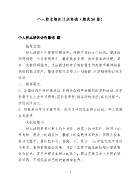 个人校本培训计划集锦(精选26篇)个人校本培训计划集锦篇1指导思想:校本培训对于提高师德修养,增进广博的文化知识,塑造政治思想好、业务素质精良、教学技能全面、教学基本功过硬,具有一定教科研能力、适应新世纪素质教育需求的高素质教师起着积极的推动作用。根据学校校本培训计划安排,本学期特制订校本计划二、提高要点:1、加强组内听课评课活动,积极参加教研室组织的学科活动,派学科骨干走出去学习研修,实行老带新,新互动的活动,在此过程中,实现共同成长。2、积极参与学校丰富多彩、形式多样的校本培训活动,努力提高自身素质⑴积极培训校本培训具有对象上的全员性、内容上的全面性、时间上的终身性、要求上的超前性、教学上的实践性等特点。因而在校本培训过程中,要积极参与,在岗一天,培训一天;并且把校本培训与教学、教研紧密结合起来,与自己工作中出现的疑难问题紧密结合起来,真正发挥校本培训的作用,解决实践工作中出现的疑难问题,不断提高自己的教育教学能力。1⑵学有所获:A、提高课堂教学质量抓住课堂教学这个实施素质教育的中心环节,把新课程、新教材、新教法的培训与研究、教师教育教学技能培训作为校本培训工作的重点。在这个学习的过程中,努力提升自身素质。B、提高教育理论水平参与学校教育理论培训。教育理论是指导教师进行教学、教育科研的基础,教师学习并自觉运用先进的教育教学理论,遵循教育规律,才会改进教育方法,提高教育艺术。因此,必须坚持用全新的、先进的现代教育理论不断充实武装自己的头脑。C、提高师德修养积极参与教师师德培训。——这是一项长期的持之以恒的校本培训活动,在通过《教师法》《未成年人保护法》《中小学教师职业道德规范》《教师职业道德行为规范“十不准”》《中华人民共和国教师法》等培训活动中,使自己能自觉遵守教师的职业道德,按照师德规范严格要求自己,改善和学生之间的关系,真正做到教书育人、为人师表。D、提高媒体运用能...