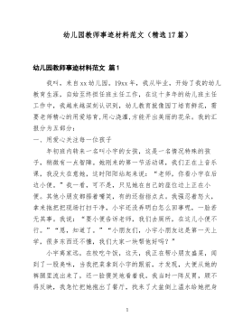 幼儿园教师事迹材料范文(精选17篇)幼儿园教师事迹材料范文篇1我叫,来自xx幼儿园。19xx年,我从毕业,开始了我的幼儿教育生涯,自始至终担任班主任工作,在这十多年的幼儿班主任工作中,我越来越深刻认识到,幼儿教育就像园丁培育鲜花,需要老师精心的用爱培育,用心浇灌,方能开出美丽的花朵。我的汇报分为五部分:一、用爱心关注每一位孩子年初班内转来一名叫小宇的女孩,这是一名情况特殊的孩子,稍微有一点智障。她刚来的第一节活动课,我们正在上音乐课,我没太在意她,这时阳阳站起来说:“老师,你看小宇在后边小便。”我一看,可不是,只见她在自己的座位边上正在小便。其他小朋友都捂着嘴笑,有的还指指点点。我强忍着怒火,拿来拖把把现场打扫干净,小宇还没弄明白怎么回事呢,一脸若无其事。我说:“要小便告诉老师,我们去厕所,在这儿小便不行。”“恩,知道了。”“小朋友们,小宇小朋友这是第一天上学,很多东西还不懂,我们大家一块帮他好吗?”小宇离家远,在校吃午饭,这天,我正在帮小朋友盛菜,闻到了一股臭味,当我把菜拿到小宇的跟前,才发现,大便从她的裤腿里流出来了,还一脸傻笑地看着我。我当时一阵反胃,顾不得反映,我急忙把她抱出了餐厅,找来了大盆倒上温水给她把身1上洗干净,然后回家把我儿子的衣服找了几件给她换上。又把她满是大便的衣服洗干净。这时,已是12点多了,我又领她去了餐厅,盛上饭,让她吃,我就在边上看着,一点食欲都没有。“老师——吃——吃。”路都走不好的.她,蹒跚地拿着一个馒头往我嘴里放。我心里一热,眼泪差点掉出来。孩子们给我带来了很多烦恼,同时也给我带了很多收获。根据自己的亲身经历教育故事《弯动的拇指,真诚的谢意》在今年7月份的《临朐教育报》上刊登。同时有多篇教育随笔发表在山东学前教育网和中国学前教育网。二、靠细心体察每一位幼儿一天户外活动时间,我带着孩子们在操场上活动,一向活的小凯懒懒散散地走来走去,也没有和...