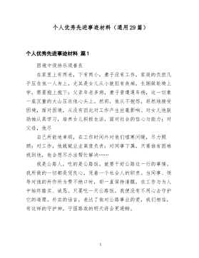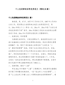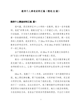 教师个人事迹材料汇编(精选32篇)教师个人事迹材料汇编篇1我叫董,是旧周学区中心小学的一名教师,做为一名年轻教师,我把"学厚为师,德高为范"这八个字谨记心间,并让它做为行动指南、行为标尺来衡量自己的教学得失。我对教育事业更有着一份执着的热爱,中师毕业的我为了提高自身素质,做一名优秀的人民教师,我刻苦努力,于20x年和20x年分别取得高等教育自学考试专科、本科毕业证书,并在20x年拿到了普通话水平一级乙等证书。由于我的基本功比较扎实,在20x年10月县教文体局举办的"任县小学青年教师基本功大赛"中荣获二等奖。做为一名年轻的教师,我不仅基础扎实,而且对教育事业更是充满了爱心,在我所教的班级内,经常会让每一位学生感受到老师的爱与关心,让每一位学生都感受到学生是老师心目中的骄傲。20x年,我教了一个二年级,当时班里有一名叫裴晓华的女孩,她上课纪律松懈,课下性格怪癖,与同学极不和群,而且爱与同学打架。她的这种行为引起了我的注意,于是我及时地对她进行了一次家访,在这次家访中,我了解到晓华这种性格行成的原因原来与她的家庭有着密不可分的联系。她从小就没有妈妈,与爸爸相依为命,爸爸由于家庭条件困难的原因,外出打工的时1间较多,只留下这么小的孩子,独自照顾自己的生活起居。看到这种情况,我明白了,因为晓华缺少母爱,才形成了这种性格,唯有母爱的呵护,才能让这棵幼苗健康茁壮的成长,唯有母爱的滋润,才能抚慰孩子心中的不平,弥补孩子心中的缺憾。在以后的日子里,我总是刻意的去关照这个孩子,向其他同学讲她如何的聪明能干、如何的懂事孝顺,树立她在同学们心中的形象。在工作之余尽量抽出时间给她补习功课,教给她如何合理利用时间;生活上更是倾心而为,每逢家里做好吃的就让同龄的女儿请她回家一起吃饭。暑假期间,她的爸爸外出打工,我就把晓华叫到家里照顾她的生活起居,并经常送她一些合适的衣服……经过一段时间的努力,晓华犯错的...