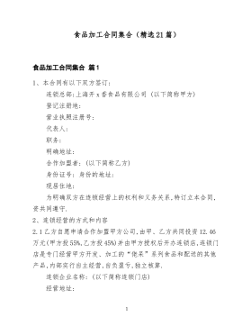 食品加工合同集合(精选21篇)食品加工合同集合篇11、本合同有以下双方签订:连锁总部:上海开x香食品有限公司(以下简称甲方)登记注册地:营业执照注册号:代表人:职务:明确地址:合作加盟者:(以下简称乙方)身份证号:身份的地址:现居住地:为明确双方在连锁经营上的权利和义务关系,特订立本合同,资共同遵守.2、连锁经营的方式和内容2.1乙方自愿申请合作加盟甲方公司,由甲、乙方共同投资12.46万元(甲方投55%,乙方投45%)并由甲方授权后开办连锁店,连锁门店是专门经营甲方开发、加工的“佬呆”系列食品和配送的其他产品,内部实行自主经营,自负盈亏,独立核算.连锁企业名称:(以下简称连锁门店)经营地址:12.2甲方向合伙门店授予连锁经营权并提供管理体系.2.3管理体系包括专用的商业名称、商标、店面装修指引、培训体系、财务体系、“佬呆”系列食品、经营指导、开业指导、管理手册,核心是“佬呆”商标,“佬呆”系列食品和经营管理标准.2.4连锁企业的经营范围:熟食系列及公司的代理产品.3、连锁经营费用3.1甲乙双方合作经营,加盟费不收.3.2管理费:第一年内不收,第二年开始按第一年营业额等级收取,营业额100万元以内,按每月200元上交上级公司;营业额100万元以上,按每月300元上交上级公司.注:管理费为上级公司对合作加盟店员工培训、管理、广告宣传以及货物配送的贴补,管理费可作经营成本.3.3货款和结算:营业额为活动资金,当日营业额第二天交品牌出让方周转,第二个月的5日由品牌出让方按上月营业额25%的商业毛利返回.4、甲方的权利和义务4.1提供开办合伙连锁门店所需的证明材料.4.2为连锁门店提供骨干人员上岗前的专业培训,并根据需要定期进行再培训.4.3甲方在合同有效期内提供《上海开x香食品有限公司连锁经营管理手册》,(以下简称《手册》),《手册》属于甲方所有,未经甲方书面许可,乙方或连锁门店...