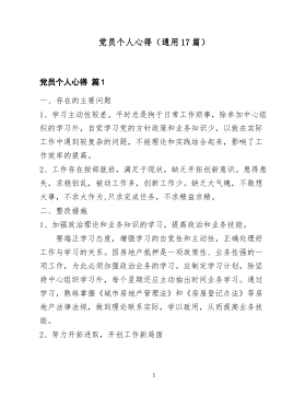 党员个人心得(通用17篇)党员个人心得篇1一、存在的主要问题1、学习主动性较差。平时总是拘于日常工作琐事,除参加中心组织的学习外,自觉学习党的方针政策和业务知识少,以致在实际工作中遇到较复杂的问题,不能理论和实践结合起来,影响了工作效率的提高。2、工作存在按部就班,满足于现状,缺乏开拓创新意识。患得患失,求稳怕乱,被动工作多,创新工作少。缺乏大气魄,不敢想大事,不求大作为,只求完成任务,不求精益求精。二、整改措施1、加强政治理论和业务知识的学习,提高政治和业务技能。要端正学习态度,增强学习的自觉性和主动性,正确处理好工作与学习的关系。因房地产抵押是一项政策性、业务性强的一项工作,为此必须加强政治业务的学习。应制定学习计划,除坚持中心组织学习外,每个星期还应主动抽出时间业务学习。通过学习,熟练掌握《城市房地产管理法》和《房屋登记办法》等房地产法律法规,做到理论联系实际,学以致用,从而提高业务技能。2、努力开拓进取,开创工作新局面1干一行、爱一行、专一行,这是对各种从业人员的基本要求,在工作中,如何做到“专”,这不仅是要做好本职工作,更重要的是致力于这一领域的探索改革与创新。这就要求在今后工作中认真履行工作职责,增强创新意识,进一步更新观念,学习老同志的工作经验,勤于思考,谨慎工作,努力开创工作新局面。3、改进工作作风,提高工作效率要克服官僚主义、形式主义作风,坚持“内强素质,外树形象”的八字风,树立房产良好的社会形象。积极开展以服务群众、奉献社会为宗旨,以群众满意为标准,不断改进服务态度,提高服务质量,努力做到态度要热情,服务要周到、办事要高效。坚持“特事特办、一般事勤办”从而提高工作效率。通过在不断的学习和工作实践中,发现的问题和毛病还有很多很多,在以后的工作和生活中不断完善自己,要破除“与己无关”无所作为的思想,牢固树立公仆意识、职责意识,要敬业爱岗,尽职尽责,立足本职岗...