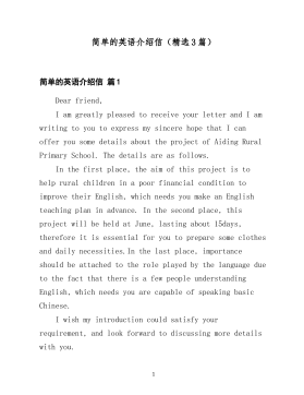简单的英语介绍信(精选3篇)简单的英语介绍信篇1Dearfriend,IamgreatlypleasedtoreceiveyourletterandIamwritingtoyoutoexpressmysincerehopethatIcanofferyousomedetailsabouttheprojectofAidingRuralPrimarySchool.Thedetailsareasfollows.Inthefirstplace,theaimofthisprojectistohelpruralchildreninapoorfinancialconditiontoimprovetheirEnglish,whichneedsyoumakeanEnglishteachingplaninadvance.Inthesecondplace,thisprojectwillbeheldatJune,lastingabout15days,thereforeitisessentialforyoutopreparesomeclothesanddailynecessities.Inthelastplace,importanceshouldbeattachedtotheroleplayedbythelanguageduetothefactthatthereisafewpeopleunderstandingEnglish,whichneedsyouarecapableofspeakingbasicChinese.Iwishmyintroductioncouldsatisfyyourrequirement,andlookforwardtodiscussingmoredetailswithyou.1YoursSincerely,LiMing简单的英语介绍信篇2DearSir,I’maChinesest...