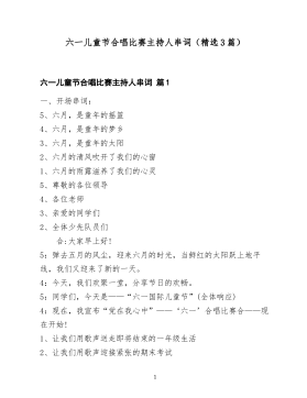 六一儿童节合唱比赛主持人串词(精选3篇)六一儿童节合唱比赛主持人串词篇1一、开场串词:5、六月,是童年的摇篮4、六月,是童年的梦乡3、六月,是童年的太阳2、六月的清风吹开了我们的心窗1、六月的雨露滋养了我们的心灵5、尊敬的各位领导4、各位老师3、亲爱的同学们2、全体少先队员们合:大家早上好!5:弹去五月的风尘,迎来六月的时光,当鲜红的太阳跃上地平线,我们又迎来了新的一天。4:今天,我们欢聚一堂,分享节日的欢畅。5:同学们,今天是——“六一国际儿童节”(全体响应)4:现在,我宣布“党在我心中”——‘六一’合唱比赛合——现在开始!1、让我们用歌声送走即将结束的一年级生活2、让我们用歌声迎接紧张的期末考试13、让我们用歌声送走鲜花盛开的春天4、让我们用歌声欢庆我们自己的节日5、让我们用歌声歌颂可爱的祖国,伟大的党!合:唱吧,唱吧,让我们尽情歌唱吧!二、合唱曲目串词1、二年(1)班《共产儿童团歌》准备了好吗?时刻准备着,我们都是中国共产儿童团,将来的主人必定是我们。这是多么熟悉的旋律啊,请听由二年(1)班同学带来的《共产儿童团歌》,大家热烈欢迎!12、六年2班《弹起我心爱的土琵琶》西边的太阳快要落山了,微山湖上静悄悄,弹起我心爱的土琵琶,唱起那动人的歌谣。爬上飞快的火车,像骑上奔驰的骏马,车站和铁道线上,是我们杀敌的好战场接下来请听由六年2班带来的《弹起我心爱的土琵琶》,大家热烈欢迎!3、三年(3)班《我们要做雷锋的好榜样》学习雷锋好榜样,忠于革命忠于党。爱憎分明不忘本,立场坚定斗志强。接下来请听由三年(3)班《我们要做雷锋的好榜样》,大家热烈欢迎!4、五年(1)班童心是小鸟2我把小树苗栽到,春天的故事里,我把小蜻蜓送回,夏天的目光里我把小鸽子放飞在秋天的歌声里,我把小雪人堆在冬天的童话里接下来请听五年(1)班带来的《童心是小鸟》5、一年(5)班我爱北京*我爱北京*,*上太阳升,伟...