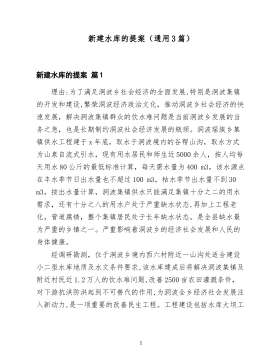新建水库的提案(通用3篇)新建水库的提案篇1理由:为了满足洞波乡社会经济的全面发展,特别是洞波集镇的开发和建设,繁荣洞波经济政治文化,推动洞波乡社会经济的快速发展,解决洞波集镇群众的饮水难问题是当前洞波乡发展的当务之急,也是长期制约洞波社会经济发展的瓶颈。洞波瑶族乡集镇供水工程建于x年底,取水于洞波境内的谷帮山沟,取水方式为山泉自流式引水,现有用水居民和师生近5000余人,按人均每天用水80公斤的最低标准计算,每天需水量为400m3,该水源点在丰水季节日出水量也不超过100m3,枯水季节出水量不到30m3,按出水量计算,洞波集镇供水只能满足集镇十分之二的用水需求,还有十分之八的用水户处于严重缺水状态,再加上工程老化,管道腐锈,整个集镇居民处于长年缺水状态。是全县缺水最为严重的乡镇之一。严重影响着洞波乡的经济社会发展和人民的身体健康。经调研勘测,位于洞波乡境内西六村附近一山沟处适合建设小二型水库地质及水文条件要求,该水库建成后将解决洞波集镇及附近村民近1.2万人的饮水难问题,改善2500亩农田灌溉条件,对下游抗洪防洪起到不可替代的作用,为洞波全乡经济社会发展注入新动力,是一项重要的改善民生工程。工程建设包括水库大坝工1程,管道安装工程和灌溉渠系工程三大部分,预算总投资2892.94万元。实施意见或建议:1.建议县政府尽快向上级争取项目立项开工建设;2.县水务局做好地勘、工程施工、技术指导和质量监督等工作。新建水库的提案篇2内容:xx县花甲乡那耶村委会所辖7个自然村10个村小组,共668户3030人,所有村寨都居住在海拔1000米以上,且都是高山区,山高坡陡,吃水难,灌溉难。全村委会共有国土面积22.4平方公里,耕地面积5620亩,其中稻田5112亩,均是连片山地梯田,旱地508亩。那耶整个村委会的稻田都是依靠引那耶河水灌溉,由于稻田都是梯田,耕作难度大,渠长田少,且渠道多为土...