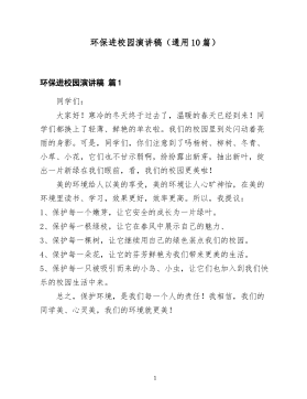环保进校园演讲稿(通用10篇)环保进校园演讲稿篇1同学们:大家好!寒冷的冬天终于过去了,温暖的春天已经到来!同学们都换上了轻薄、鲜艳的单衣啦。我们的校园里到处闪动着亮丽的身影。可是,同学们,你们注意到了吗杨树、柳树、冬青、小草、小花,它们也不甘示弱啊,纷纷露出新芽,抽出新叶,绽出一片新绿在我们眼前,看,我们的校园更美啦!美的环境给人以美的享受,美的环境让人心旷神怡,在美的环境里读书、学习,效果更好,效率更高。所以,我提议:1、保护每一个嫩芽,让它安全的成长为一片绿叶。2、保护每一根绿枝,让它在春风中展示自己的魅力、3、保护每一棵树,让它继续用自己的绿色装点我们的校园。4、保护每一朵花,让它的芬芳鲜艳为我们带来更美的生活。5、保护每一只被吸引而来的小鸟、小虫,让它们也加入到我们快乐的校园生活中来。总之,保护环境,是我们每一个人的责任!我相信,我们的同学美、心灵美,我们的环境就更美!1环保进校园演讲稿篇2同学们:大家早上好!我们都知道,校园环境是一个学校的窗口,直观地反映了学校的精神风貌,体现了学校的文化氛围。洁净、舒适、安全的校园环境不仅是我们学习生活的需要,而且是陶冶情操的需要,营造优良的校园环境是我们每个人的神圣职责。为此,我们学校在第五周在初一、初二、高一、高二级开展了“爱我校园,美化校园”献花活动,四个年级的同学积极响应,怀着对学校的爱心,为学校的美化绿化贡献自己的一份力量。同学们有的把家里平时培育的盆栽献给母校,有的拿出自己积攒的零花钱购买鲜花带到学校,更令我们感动的是我们的家长带着孩子把家里培养的漂亮盆栽送到学校。几天的时间,上百盆品种各异的绿色植物,摆放在教学楼各楼层的各个角落,校貌顿时焕然一新,到处生机盎然。绿色是生命的象征,绿色代表了希望。小小的一盆植物,为全校师生的工作、学习、生活增添了色彩,给我们带来愉悦的心情。与此同时,在上一周我们开展了全校性的“清洁...