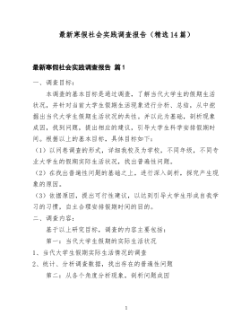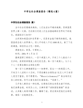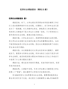 优秀社会调查报告(精选33篇)优秀社会调查报告篇1调查目的:时下,大学生通过利用课余时间找份兼职工作打打工或在假期积极参与社会实践,打暑期工、实习体味生活已经成为了一股热潮。对大多数学生而言,挣钱是打工的首要目的。有的却认为挣钱并不是大学生打工的惟一目的,不少同学把打工看作是参加社会实践、提高自身能力的机会。调查对象:大学生成长成才,是高等院校普遍关注的问题。而大学生社会实践已成为培养合格大学生的重要组成部分,也决不能忽视或放弃大学生社会实践。因此这次调查就选择了在读大学生50名进行调查。调查内容:本次调查通过对大学生有否参加过暑期工、兼职或实习,最想参与何种社会实践,所参与的打工或实习是否与所学专业相符,能否体现实践与理论知识相结合以及在工作或实习中获得了什么等问题进行展开.调查方法:通过派发问卷进行调查,发放问卷共50份,收回有效问卷50份.调查结果:从调查中发现,许多大学生都认为兼职是大学生的第二个"课堂",通过兼职可以学到许多宝贵的东西。有52%的同学认为如果要参加社会实践,最理想的就是到企事业单位进行实习交流,其次是打工或做兼职占40%;而56%的同1学有做过兼职,20%打过暑期工,14%参与过实习,表示从未做过的仅占10%;现在大学生兼职、打工,除了做家教(14%)、网络的实习实践(6%)外,越来越多的大学生在兼职或打工时从事派传单、商品促销(22%)、校园销售(14%)、当餐厅服务员(8%)等简单、不需要特殊技能的工作,但却与所学专业知识相去甚远,76%学生认为所实习或兼职的工作与自己专业不全相符或完全不符,仅24%的人认为完全或基本相符。能够使大学里的理论知识应用到实践中去的只占38%,在实习或工作中66%的人满意自己的课外实践能力;12%的学生认为兼职是为以后的求职做准备,在选择实习或打工目的是什么的时候,有32人选择"接触社会,积累工作经验",占了总数的...