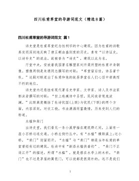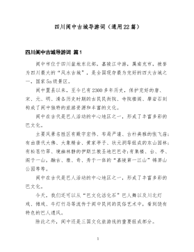 四川旅游俄语导游词(精选9篇)四川旅游俄语导游词篇1уважаемыегости,добропожаловатьнанашузнаменитуюэкскурсиювдревнийгородсычуань.городнаходитсянасевересычуаньскойкотловины,нарекеЦзялинцзян,ГородпостроенвгорахБайшань,горацзяньмэньисистемарекицзяллинь,соединяются,горыокружены,водавокругтрехСторон,ситуацияоченьопасна.ранееонсказал,что"шестьведущихдивизий,азатем,поданнымзернасычуаньскойобласти,слевапройтивцзинсян,справаизциньлун".Снезапамятныхвременэтобылкрупныйвоенныйгород,которыйв1986годубыл1объявленгосударственнымдепартаментомоднимизизвестныхисторическихикультурныхгородовстраны.Нашасегодняшняяэкскурсияорганизованаследующимобразом:сначалаэкскурсияпохрамуЧжанФэйигорамЦзинь-шань,потомэкскурсияпооченьсвоеобразномузаповедникудревнегогорода.Позвольтемнетеперьвкратцеознакомитьвассособенностямистарогогорода.древностьвоткрыто...