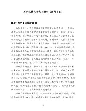黑龙江热门景点导游词(精选3篇)黑龙江热门景点导游词篇1各位团友大家好:您一路辛苦了!首先我代表_-x旅行社欢迎各位团友来黑龙江省旅游,我是咱们这个团的导游员,我叫陈彤,大家可以叫我“小陈”或“陈导”。为我们开车的师傅叫刘刚,刘师傅已经有十几年驾驶旅游车的经历,技术十分娴熟。我和刘师付非常愿意为大家提供满意的服务。同时我们也衷心希望各位团友在黑龙江玩的开心、愉快。我们马上要到达的第一站是今晚入住的酒痁,车行大约需要十五分钟的时间,下面我利用这段时间向您介绍一下我们黑龙江省的概况。黑龙江省位于我国的东北部,是我国位置最北、纬度最高、太阳升起最早的省份。我国的最北端就在黑龙江省的漠河一带,那里被称为“中国的北极”。我国的最东端在乌苏里江和黑龙江汇流处,那里了是我国太阳升起最早的地方,因此被称为中国的“东极”。黑龙江省简称“黑”,它的名字是因为省内最大的河流叫黑龙江,因此而得名的。黑龙江的版图形似一只振翅欲飞的天鹅,因此,天鹅是富饶美丽的黑龙江的象征。我们黑龙江省的土地面1积45万多平方公里,在全国各省中居第六位。说起黑龙江的特征呢!可以用一个“大”字来概括,这里有中国最大-片的森林,有中国面积最大的湿地——大家熟悉的扎龙自然保护区就在这里,这里有世界上最大的界江——黑龙江,有亚洲最大的界湖——兴凯湖,有亚洲最大的火山堰塞湖——镜泊湖,有中国最大的火山地貌景观——五大连池风景区,有世界上最大的雪堡——牡丹江雪城堡,这里还有世界上最大的养熊基地…….您知道吗?黑龙江省动植物资源相当的丰富,这里不仅是“东北虎的故乡”,这里还是“丹顶鹤的故乡”,这里是“红松的故乡”、“松茸的故乡”“三大硬阔之乡”。我们黑龙江还是我国主要的木材生产基地,因为这里地域辽阔、山川纵横。山地有:大兴安岭山地、小兴安岭山地、东南部山地三大山地,所以木材蓄积量、产量均居全国第一位,这里土地肥沃素以黑土地闻名天下是...