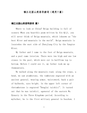 镇江北固山英语导游词(通用7篇)镇江北固山英语导游词篇1WheretolookatChina?BeigubuildingisfullofsceneryWhenyouhearthispoemwrittenbyXinQiji,youwillneverthinkofBeigumountain,whichisknownas"thebestRiverandmountainintheworld".BeigumountainislocatedontheeastsideofZhenjiangCitybytheYangtzeRiver.MyfatherandIcametothefootofBeigumountain,andapoolcameintoview.Thereweretwohighandonelowstonesinthepool,whichwerecutinhalffromtoptobottom.BeforeIcouldseeit,myfathertookmeupthemountain.Wewalkedalongthemountainroad,alongthesteps,abend,wesawatombstone,thetombstoneengravedwithanancientgeneral,wearingarmor,waistsword,backapairofhalberds,eyesbright.Intheupperleftcornerofthetombstoneisengraved"Donglaitaishici".Itturnedoutthathewastaishici,ageneraloftheeasternWuDynastyintheThreeKingdomsperiod.Accordingtomyfather,heisthefirstmilitarygeneralin...