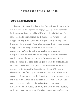 大连法语导游词参考必备(通用7篇)大连法语导游词参考必备篇1Bonjouràtouslesinvités.Toutd'abord,aunomduconducteuretdel'Agencedevoyage__,jevoussouhaitelabienvenuedanslabellevillec?tièredeDalian.Jesuisleguidetouristiquedel'Agencedevoyage__.Jem'appelleWangQian.Qianestl'argentdeQianlong,pasl'argentdeL'argent.Pourplusdecommodité,vouspouvezm'appelerXiaoWang.Devantvoussetrouveleconducteur,ma?treX,quiadenombreusesannéesd'expériencedeconduiteetdecompétencesdeconduitesupérieures,desortequetoutlemondepeutêtrecomplètementàl'aisedansleprocessusdeconduite.Lesamisquiconduisentontpeut-êtreentenduundicton:Jilinestji(urgent),MongoliaestMeng(féroce),ShanghaiestHu(Hu),puisDalianestnoiretblancpeutconduire.C'estparcequeDalianestun:leprintempsadescentainesdefleursetl'automnealalune,l'étéaleventfraisetl'hiveralaneige.Quatresaisonsdistinctesdel...