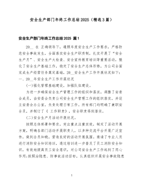 安全生产部门年终工作总结2025(精选3篇)安全生产部门年终工作总结2025篇120__在正确领导下,遵照年度安全生产工作要求,严格防范安全事故发生,全面落实安全生产职责制,扎实开展了“安全生产月”、安全生产大检查、安全宣传教育培训等重要活动,强化了安全生产基础工作,稳定了安全生产总体形势,为公司全面完成生产经营任务奠定基础,20__安全生产工作开展状况如下:一、20__年安全生产工作开展状况(一)强化管理基础建设,加强队伍建设。为进一步确保安全生产管理工作的组织和落实,调整了安委会成员,由安委会负责公司安全生产管理工作的组织落实,并设立安委会办公室,负责处理日常工作。所有部门均明确了兼职安全员,并制订了《工作职责》,安全职责得到落实。(二)安全生产月活动开展状况。按照总体部署和要求,突出重点注重实效,制定了活动开展方案,明确各部门活动开展职责人,以多种交流平台开展广泛宣传,做到全员知晓,营造良好的活动开展氛围。邀请了专业人员进行消防安全知识培训,透过培训进一步普及了员工消防安全知识,有效地提高员工安全意识,对公司安全生产工作起到了用心作用;按照治隐患、防事故活动目标,认真组织开展安全事故隐患1排查,就办公区域进行全面排查,日常安全检查工作得到较好落实。(三)安全生产大检查开展状况。按照相关文件要求,制定了安全生产大检查实施方案,并集中开展了两级安全生产大检查,检查单位覆盖了公司所有部门,下发了《安全隐患排查表》和《安全工工作自查状况表》,针对安全隐患类别逐一进行排查,梳理分析隐患可能存在原因并制定防范措施,各部门均按期上报检查状况,确保安全生产大检查各项资料得到落实。(四)安全生产宣传教育培训状况。围绕主题,充分利用会议、培训和办公系统等多种渠道,广泛宣传安全生产工作要求,组织开展各类培训。先后组织进行次隐患排查,组织次全员消防安全知识培训,增加了员工安全意识和安全防护知...