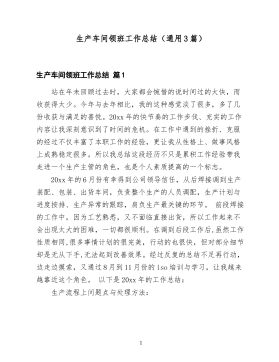 生产车间领班工作总结(通用3篇)生产车间领班工作总结篇1站在年未回顾过去时,大家都会惋惜的说时间过的太快,而收获得太少。今年与去年相比,我的这种感觉淡了很多,多了几份收获与满足的喜悦。20xx年的快节奏的工作步伐、充实的工作内容让我深刻意识到了时间的危机。在工作中遇到的挫折、克服的经过不仅丰富了本职工作的经验,更让我从性格上、做事风格上成熟稳定很多。所以我总结这段经历不只是累积工作经验带我走进一个生产主管的角色,也是个人素质提高的一个标志。20xx年的6月份有幸得到公司领导信任,从后焊接调到生产装配、包装、出货车间,负责整个生产的人员调配,生产计划与进度按排、生产异常的跟踪,肩负生产最关键的环节。前段焊接的工作中,因为工艺熟悉,又不面临直接出货,所以工作起来不会出现太大的困难,一切都很顺利。在调到后段工作后,虽然工作性质相同,很多事情计划的很完美,行动的也很快,但对部分细节却是无从下手,无法起到改善效果。经过反复的总结不足再行动,边走边摸索,又通过8月到11月份的iso培训与学习,让我越来越靠近这个角色。以下是20xx年的工作总结:生产流程上问题点与处理方法:11、初始组的输入有多个小装配组与烤机、输出的有包装,烤机。部份工作接口重复,不能形成直流,工作效率不利于提高,很多时间浪费在产品周转过程中。2、因为我们的产品装成整机后并不能实现全部功能,初始化完成以后才可以测试。所以在装配组装成整机未做出初始化前会出现很多作业员无法辨认的功能性坏机,也间接性的影响了产品质量的提高。经讨论后,取消初始化的独立管理,模拟流水线的形式。将多个小装配组合并为3个大装配组,烤机初始化合并到装配组,出厂初始化合并包装组,改善后解决了上述问题点。总结缺点:因工位调整过于仓促,未提前考虑到作业员的适应能力,导致初始化人员作业时情绪不稳定。也失去了团队中的核心技术力量。工作效率,成品率下降。3、取消...