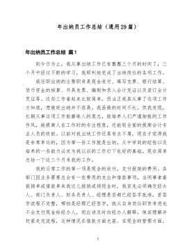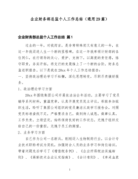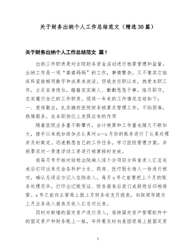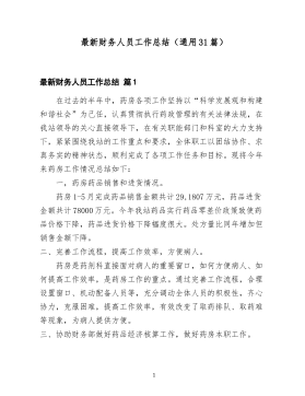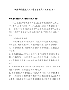 事业单位财务人员工作总结范文(通用10篇)事业单位财务人员工作总结范文篇120xx年是新中国成立63周年,是全面贯彻落实党的xx届三中、四中全会精神的第一年。本人任职计划财务处事业财务科科长,一年里在中心领导的正确领导下,在财务处长的带领下,在全体同志的帮助下,圆满地完成了各项工作任务,下面从几个方面进行总结。(一)财务管理方面能够严格按照国家有关法制、法规及长江委有关财务制度、财务法规、规章制度办事,严格按照会计法、国库资金管理办法,财务制度办事。所管理的账目经得起各项检查。主要完成以下工作:1、组织编制20xx年度机关服务中心部门决算报表及项目经费预算执行情况报表。对机关服务中心全年经济工作做一个总结,所负责完成的住房改革支出决算报表获得委预算单位决算报表先进单位。2、负责编审财政国库集中支付分月用款计划。保证中心国库资金能够及时到账,按规定要求便于单位使用。3、按照委财经局的要求20xx年组织完成了以下几个专项检查工作:一是开展会议费使用管理情况专项检查的自查工作;二是开展丧葬费、抚恤费有关支出情况调查测算工作;三是开展出国费使用1管理情况专项检查的自查工作;四是开展“水利部关于压缩20xx年出国费等三项经费预算支出”的填报工作;五是开展“小金库”专项治理的自查和重点抽查工作,六是开展“培训费”专项治理的自查的清理工作。4、按照委财经局的要求,完成全中心统一的20xx年预算算单位事业账套会计科目的设置工作,为今后财经局规定统一格式的上报报表工作提供便利。5、负责完成20xx年度两个行政事业类项目总结验收工作,通过项目验收总结工作的完成对以后年度加强项目管理提供的依据。6、负责完成了20xx年经济绩效考核指标的编报工作。7、负责中心20xx银行账户的管理工作,经过年度检查,确认我中心所有银行账户的开立、使用都是合规定和要求的,所有账户全部年检合格。8、负责机关服务中心工...
