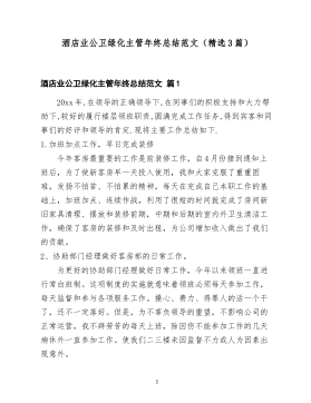 酒店业公卫绿化主管年终总结范文(精选3篇)酒店业公卫绿化主管年终总结范文篇120xx年,在领导的正确领导下,在同事们的积极支持和大力帮助下,较好的履行楼层领班职责,圆满完成工作任务,得到宾客和同事们的好评和领导的肯定.现将主要工作总结如下.1.加班加点工作,早日完成装修今年客房最重要的工作是前装修工作,自4月份接到通知上班后,为了使新客房早一天投入使用,我和大家克服了重重困难,发扬不怕苦、不怕累的精神,每天在完成自己本职工作的基础上,加班加点、连续作战,利用了很短的时间就完成了房间新旧家具清理、摆放和装修前期,中期和后期的室内外卫生清洁工作,确保了客房的装修和及时出租,为公司增加收入做出了我们的贡献。2、协助部门经理做好客房部的日常工作。为更好的协助部门经理做好日常工作,今年以来领班一直进行常白班制。这项制度的实施就意味着领班必须每天参加工作,每天监督和参与各项服务工作。操心、费力、得罪人的活一个干了,还不一定落好。但是,为不辜负领导的重望,不影响公司的正常运营,我不辞劳苦的每天上班,除因伤不能参加工作的几天病休外一直参加工作。使我们二三楼未因监督不力或人为因素出现意外。13、合理安排楼层服务员的值班、换班工作。楼层服务员换班值班是一个非常重要的环节。做到让服务员既做好公司工作又不误家里的事宜,我们采取领班每天跟白班的方式,使领班将能操的心都操到,能够即时的监督服务员的每一项工作。4、配合经理做好各项接待、安排工作,工作期间发现问题及时处理,有疑难问题应及时上报领导。做为领班,最主要的工作是配合部门经理做好各项上传下达疑难问题等。开张初,各项工作有待理顺。我在手伤未愈的情况下投入到开张顾客的接待工作中。很多的顾客,有的是住宾馆的,有的是来庆贺的,众多陌生的面孔来来往往,加上一大部分工作人员也是新手。我暗暗稳住自已,对每个工作人员的每一个细节进行跟踪,提醒,做细致的安排,使开...