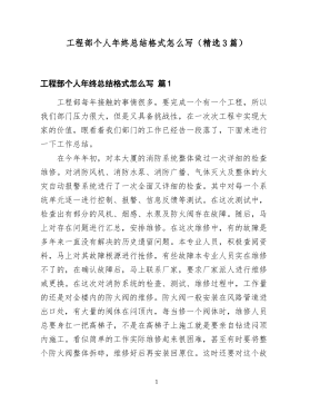 工程部个人年终总结格式怎么写(精选3篇)工程部个人年终总结格式怎么写篇1工程部每年接触的事情很多,要完成一个有一个工程,所以我们部门压力很大,但是又具备挑战性,在一次次工程中实现大家的价值,眼看着我们部门的工作已经告一段落了,下面来进行一下工作总结。在今年年初,对本大厦的消防系统整体做过一次详细的检查维修。对消防风机、消防水泵、消防广播、气体灭火及整体的火灾自动报警系统进行了一次全面又详细的检查。其中对每一个系统单元逐一进行控制、报警、信息反馈等测试。在这次测试中,检查出有部分的风机、烟感、水泵及防火阀存在故障。随后,马上对存在问题进行汇总,安排维修。在这次维修中,有的故障是多年来一直没有解决的历史遗留问题。本专业人员,积极查阅资料,马上对其故障根源进行抢修,有些故障本专业人员实在维修不了的,在确认故障后,马上联系厂家,要求厂家派人进行维修或更换。在这次对消防系统的检查、测试、维修过程中,工作量的还是对全楼内的防火阀的维修。防火阀一般安装在风路管道进出口处,有大量的阀体在闷顶内,每当修一个阀体时,维修人员总要身扛一把高梯子,不是在高梯子上施工就是要亲自钻进闷顶内施工。看似简单的工作实际维修起来很困难,甚至有时要将整个防火阀整体拆碎,维修好后再安装回原位。这时还要对这个故1障阀进行系统报警测试,确认故障确已排除后对再这次维修进行分析总结,并做好了维修记录。经过统计,在这次维修中共对大厦内二十多个防火阀进行了大修。随着大厦知名度的提高,一些有名的大型企业也开始入住本大厦,有日本的卡不利奥、中国航信、日立等。本专业人员为了给自己公司创收,积极的承接了所入住公司的综合布线工作,这也是为了大厦的整体布线水准及日后的快捷检查维修做好铺垫。在对这些公司进行布线施工中,我专业人员主动加班加点,保证工期的按时完工做出巨大的努力。在施工过程中,有些线槽在顶棚中,布线人员必须要钻进闷顶内,顺着桥...